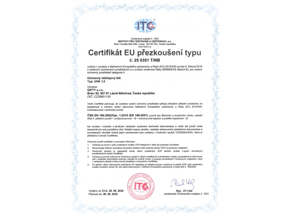 - Certifikovaná ochranná osobní pomůcka (OOP) proti kapénkám a postřiku kapalinami